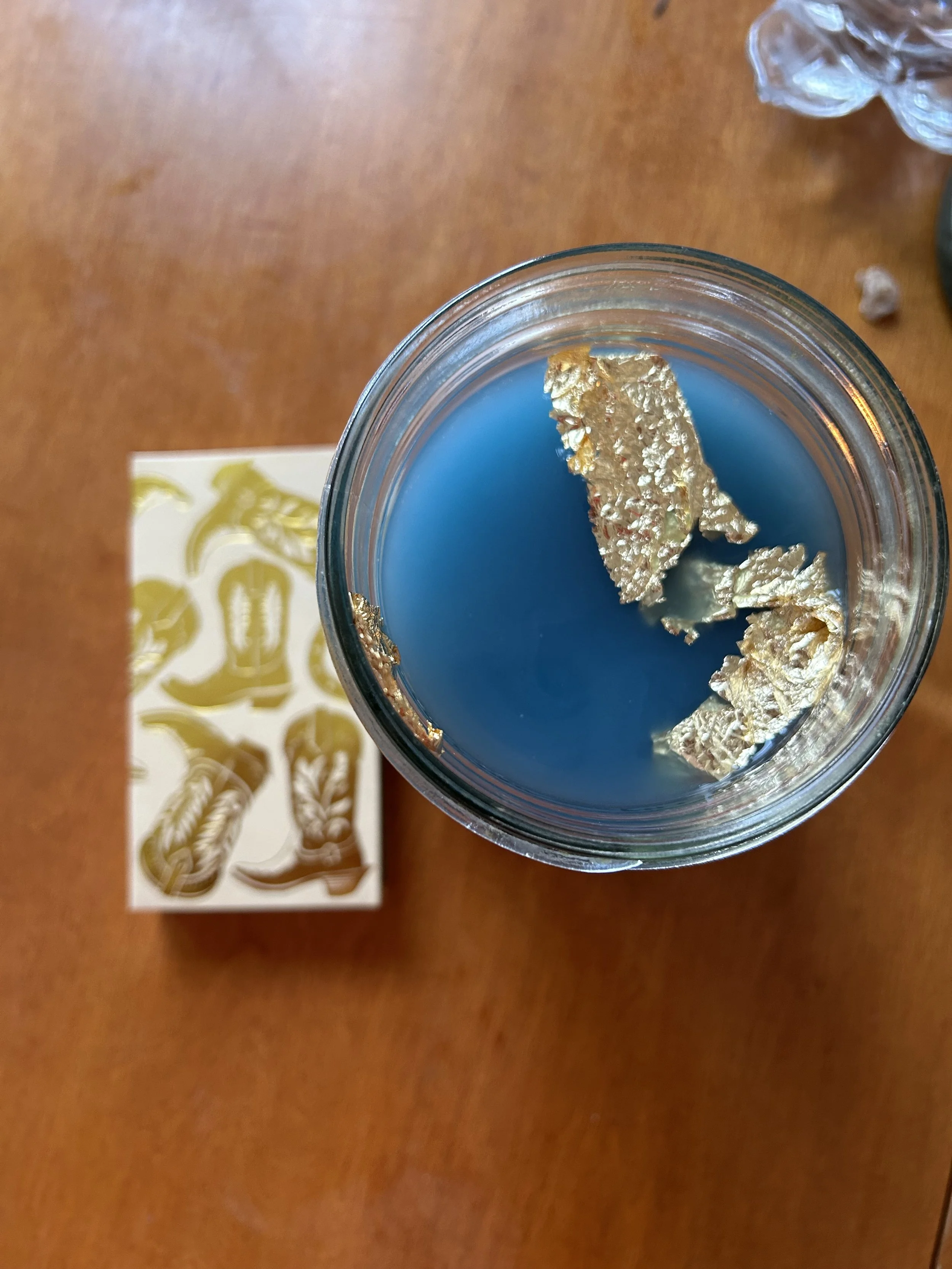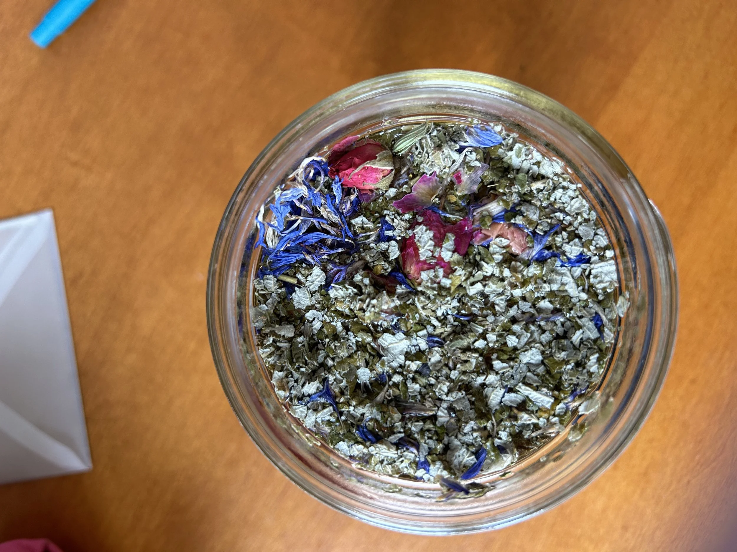 Shown above, a blend of blue corn flower, rose, and red raspberry leaf. Below, a blend of butterfly pea and gold.
